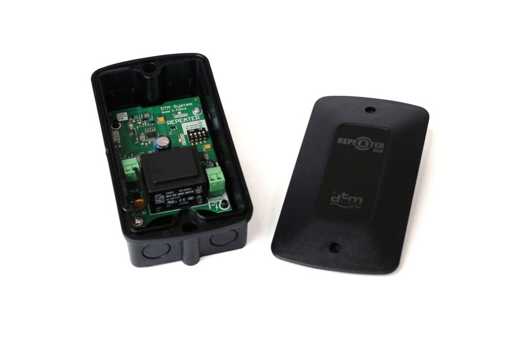| interfejs użytkownika: | diody sygnalizujące zasilanie i retransmisję sygnału, przełączniki dip switch do ustawienia opóźnienia nadawania oraz nadawania bez opóźnień |